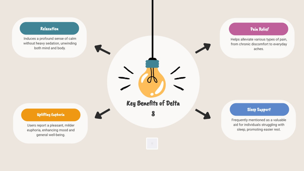 - Euphoria: While milder than Delta-9, Delta 8 is often associated with a pleasant, uplifting euphoria. This can contribute to an improved mood and a general sense of well-being.