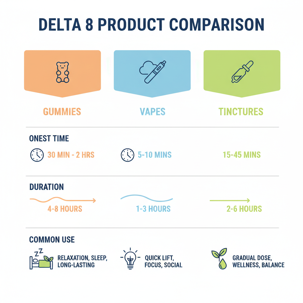 Product Type Onset Time Duration Common Use Case Gummies 30 minutes – 2 hours 4-8 hours Sustained relaxation, sleep support, long-lasting mild high Vapes Minutes (5-10 mins) 1-3 hours Quick mood lift, focus, social situations Tinctures 15-45 minutes (sublingual) 2-6 hours Gradual onset, customizable dose, general wellness Pre-rolls Minutes (5-10 mins) 1-2 hours Immediate effects, traditional smoking experience This table provides a general overview, but individual experiences can vary based on metabolism, dosage, and product formulation.